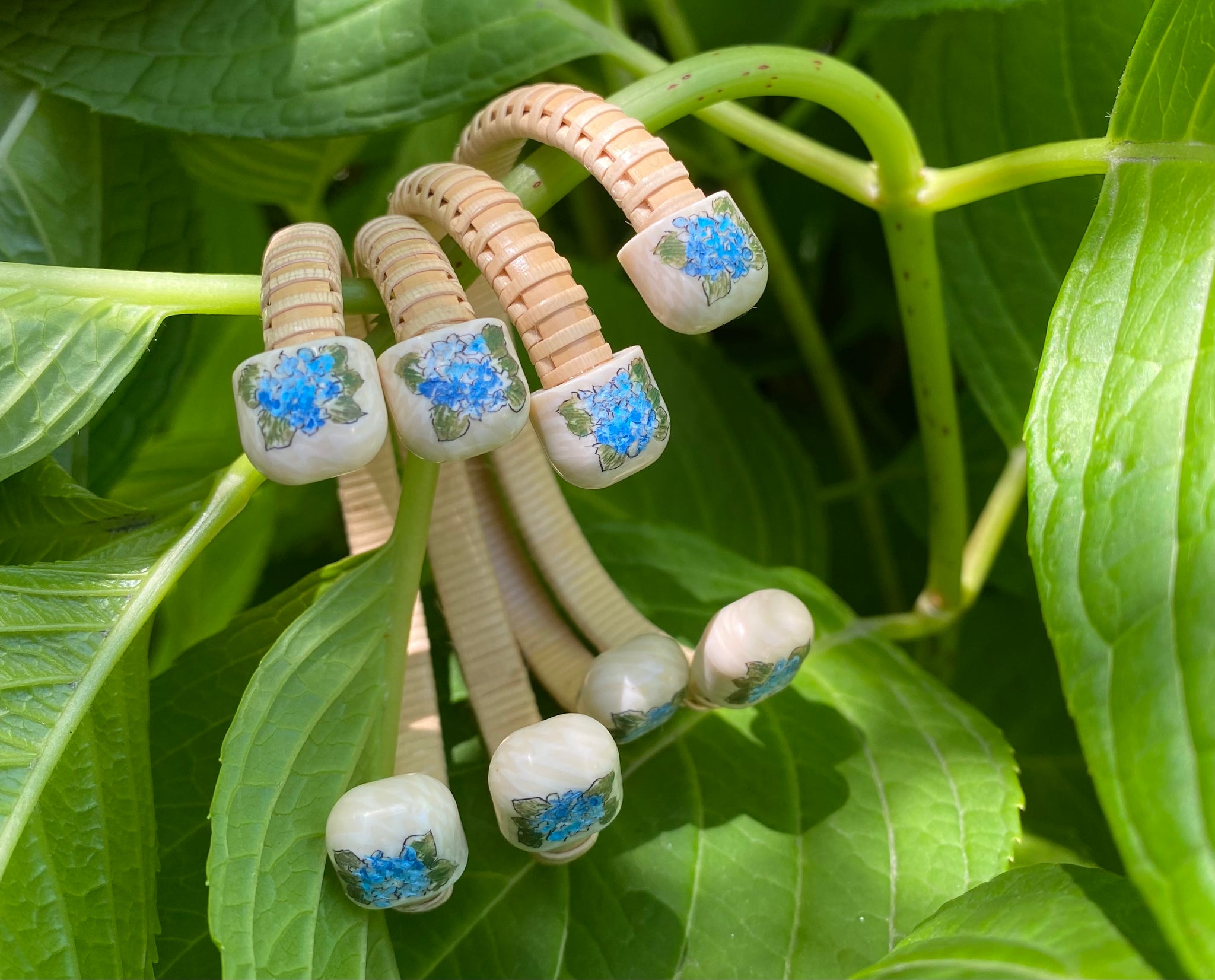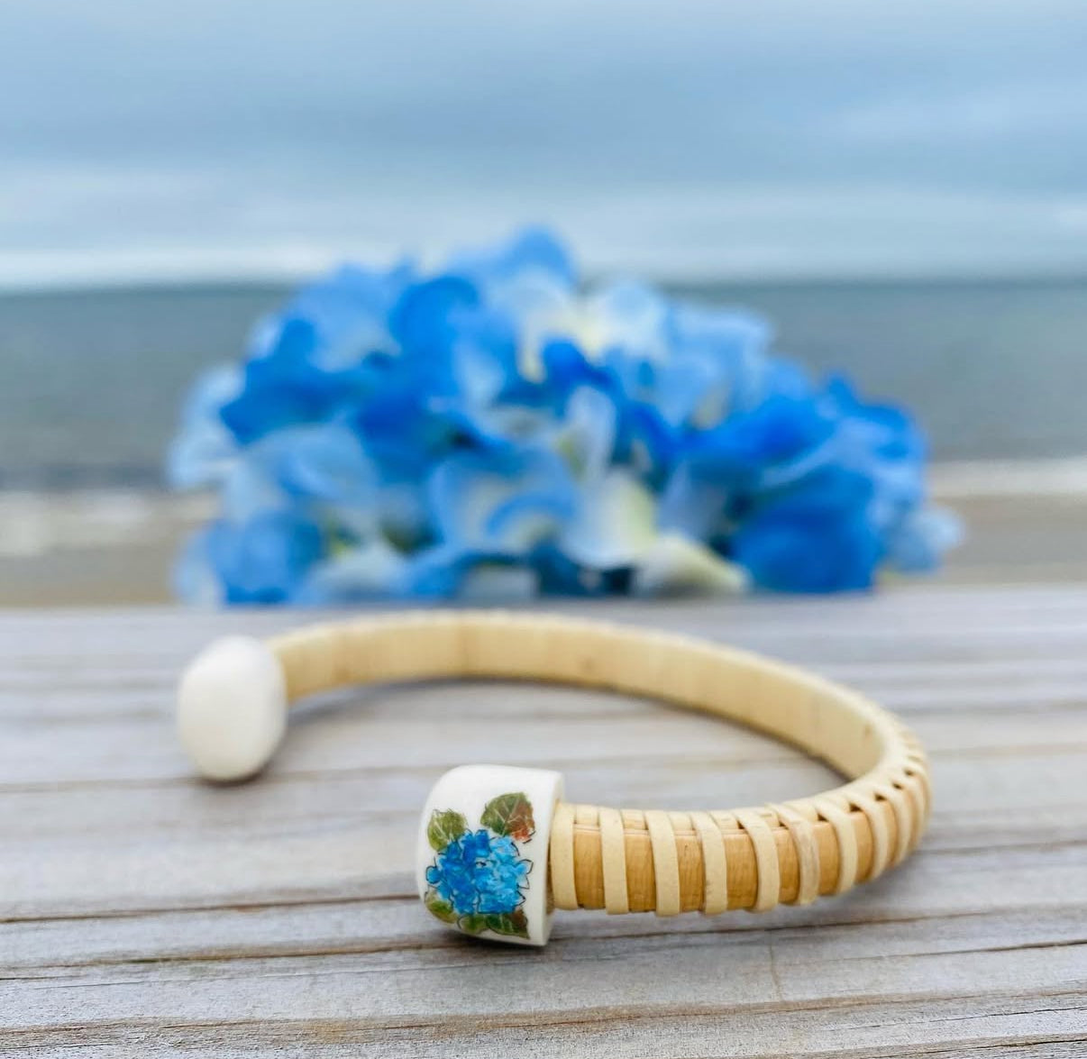 This beautiful 1/4” natural woven cuff features eco-ivory endcaps with scrimmed Nantucket blue hydrangeas! This is the perfect staple cuff for any Nantucket lover.