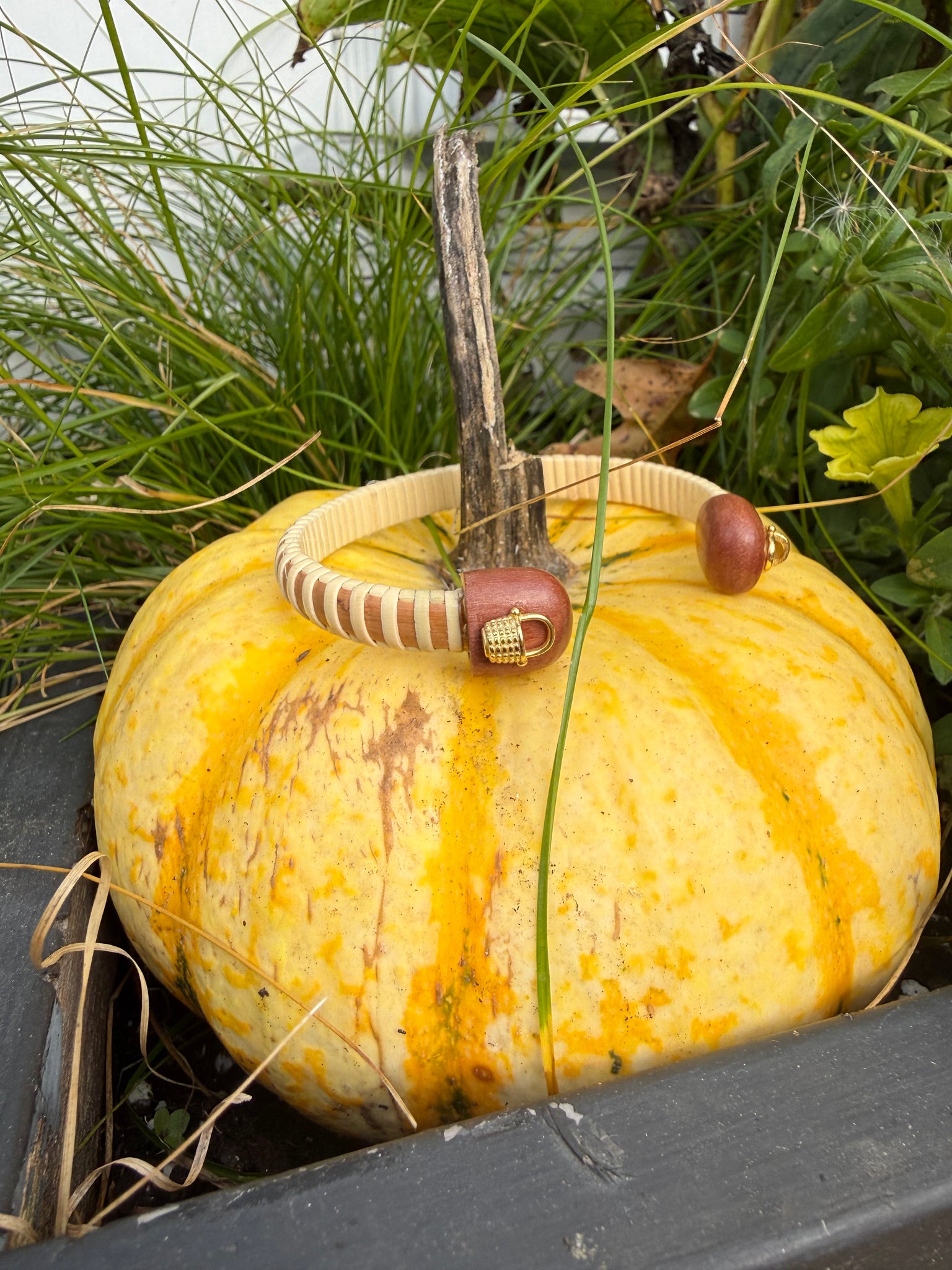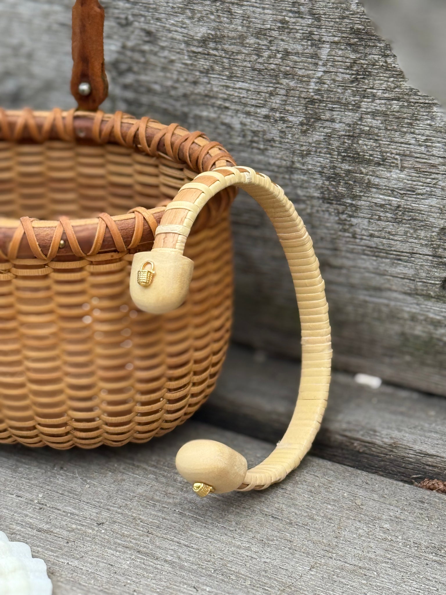 Introducing the Nantucket Mini Basket Cuff. Hand-woven with natural cane and dark wood, adorned with Tahitian wood endcaps and mini gold baskets, this 1/4" cuff is a unique and elegant addition to any outfit.