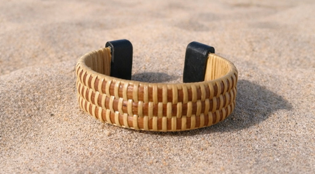 Experience the elegance and natural beauty of Nobadeer beach with our Nobadeer Cuff. Crafted with dark brown or black wood endcaps, this 3/4” cuff captures the essence of the sandy shores. Perfect for a night out or a casual beach brunch, make a statement with this unique and stylish cuff.