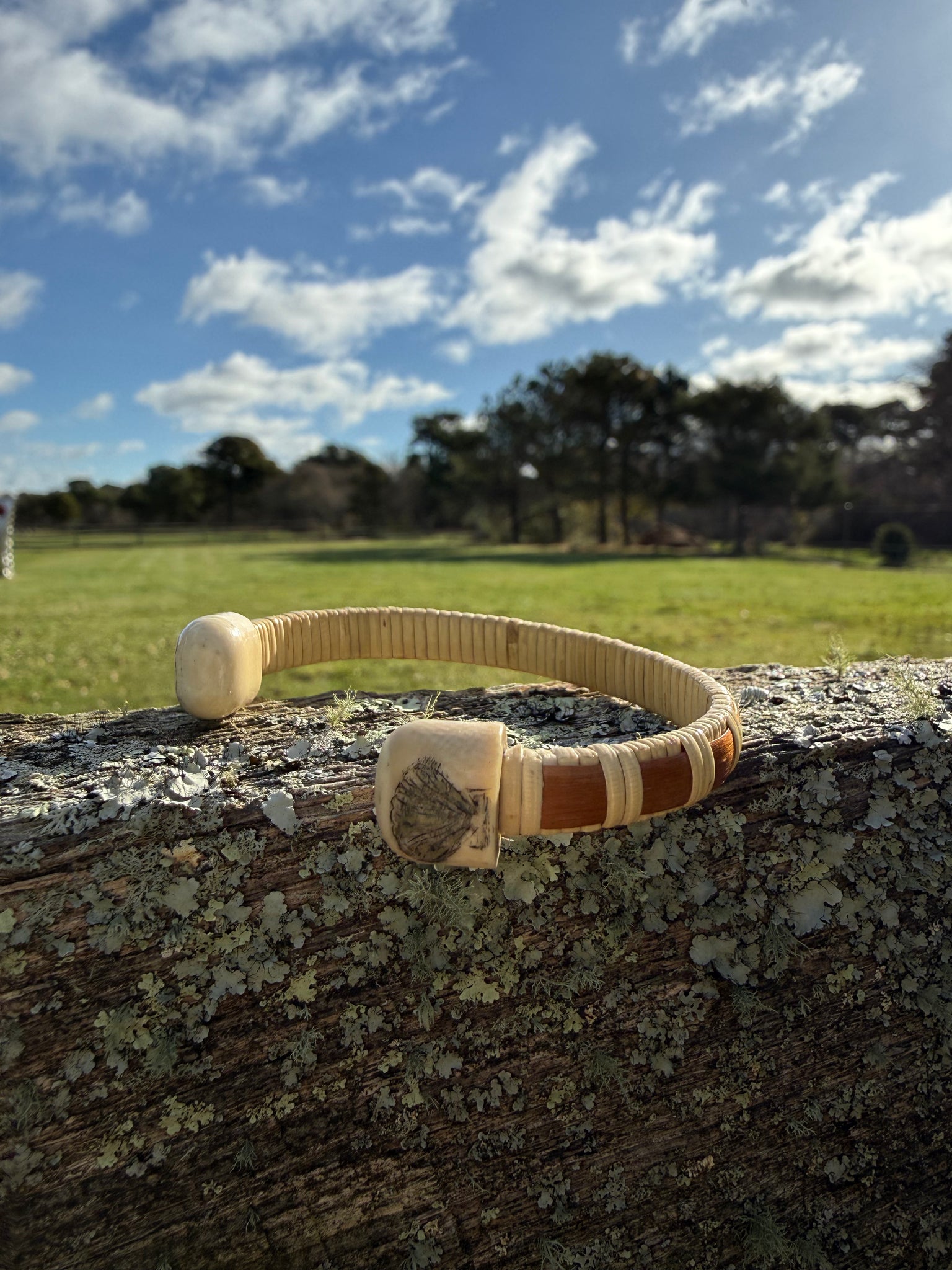 Experience the rich history of the sea with The Antique Whaler Cuff. This 1/4" woven cuff features a dark wood stave and antique whale ivory, delicately scrimmed with a scallop shell and yellow and blue sailboats. A unique addition to any jewelry collection.